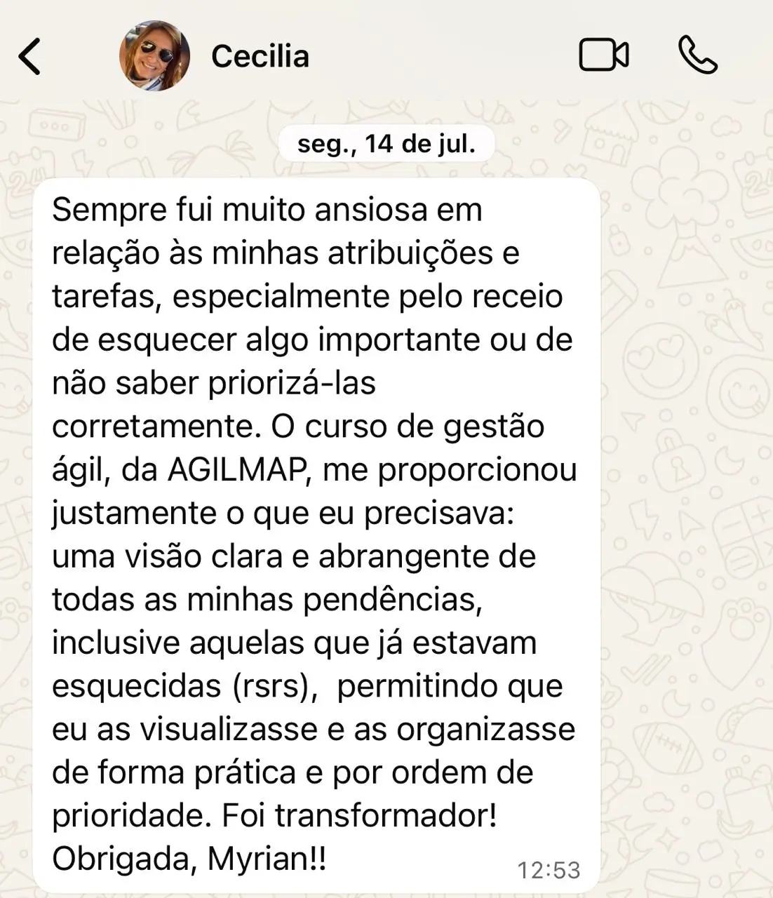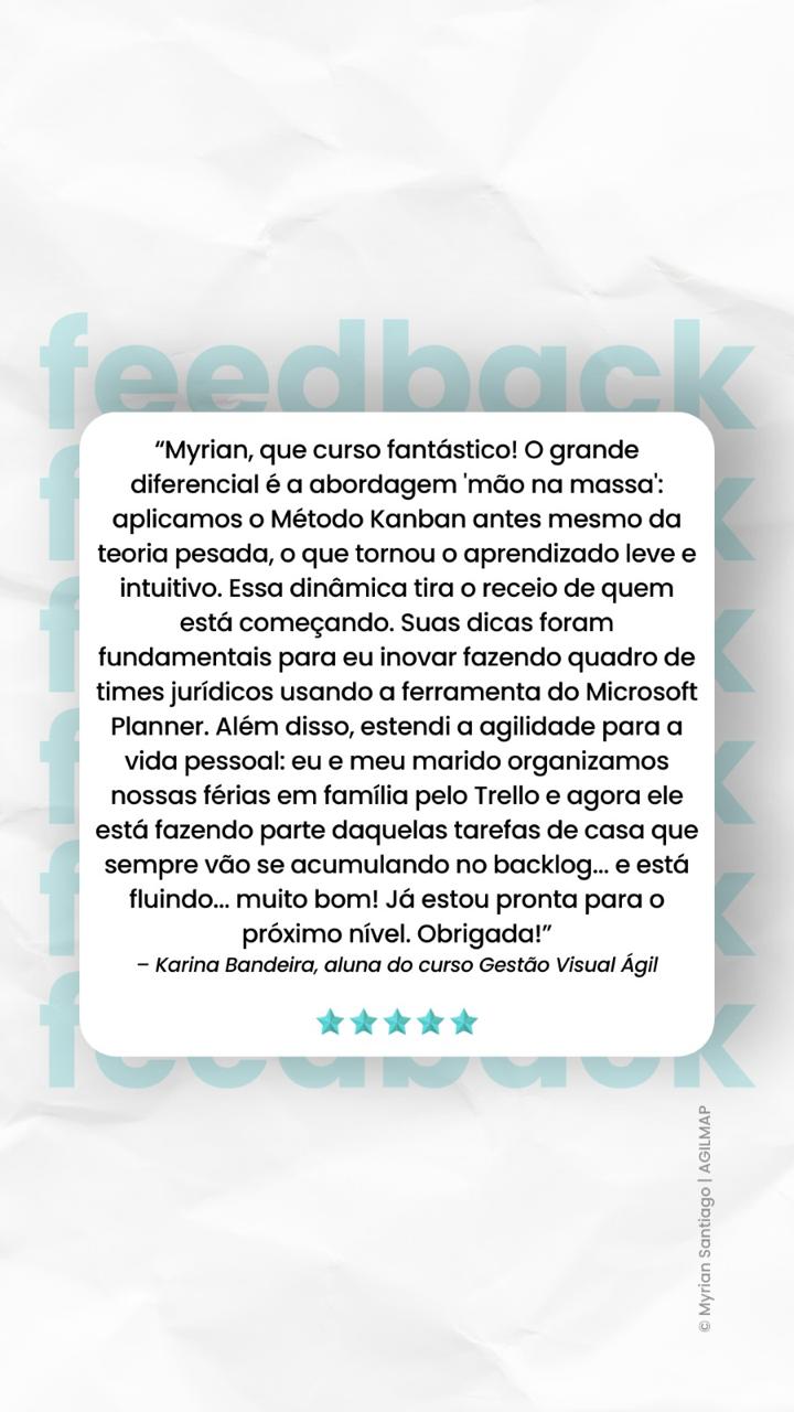 Com uma abordagem única já aplicada em mais de 60 times que utilizam quadros de gestão visual ágil, tive o privilégio de impactar a vida de mais de 300 profissionais (de várias regiões do Brasil, Sul, Sudeste e Nordeste), ajudando-os a conquistar mais controle, previsibilidade, priorização clara, mais tempo livre e uma saúde mental mais equilibrada.